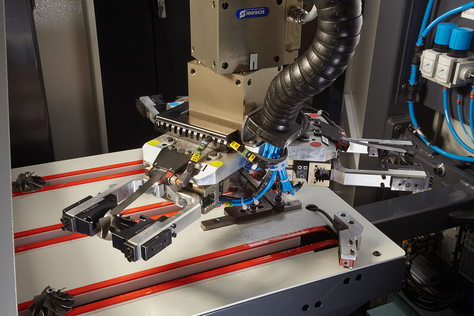 Measurement and correction of dynamic unbalance of machined turbocharger compressor wheels, use of the machine in mid- to large-volume production. Fully automatic unbalance measurement and correction through polar milling in two planes and with up to two correction steps. Loading and unloading by gantry loader.Design